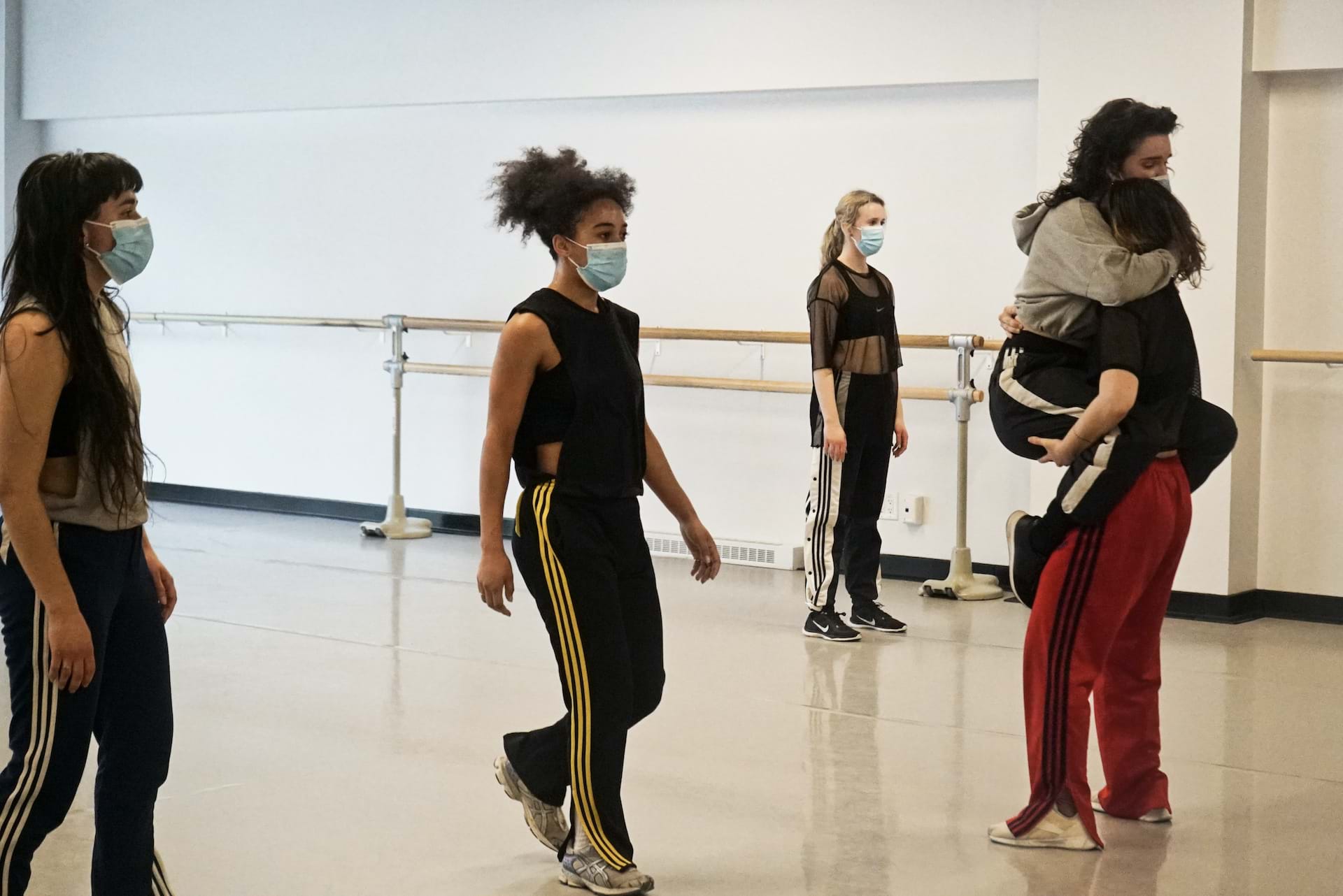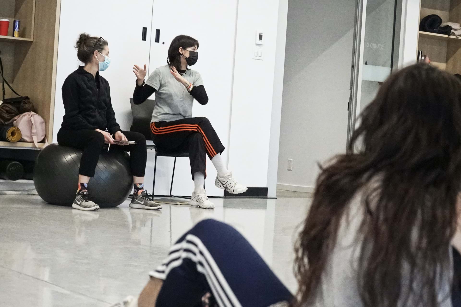 We had three weeks to create this work. There are different layers inside of the way we work. So, the first week, Erin O'Loughlin came in and taught the base material because she's very structural, very organized and she knows the material really well. She's all about the form of the body because in our work, we're trying to work on the texture, the form and the language of the body. So, she was able to bring this very structural body and textural language to the work. But then, we needed to shift our focus to what the dramaturgy of the interpreter was. So, the second week, we had one of our dancers, Jean-Benoît Labrecque, work with the students, who has a more dramaturgical eye. He was able to bring the sort of disruptive and playful posture : How does the interpreter make a choice? How do they play? What do they activate? How do they disrupt? So the students had been offered two different approaches before I came in and finished all of the structures.