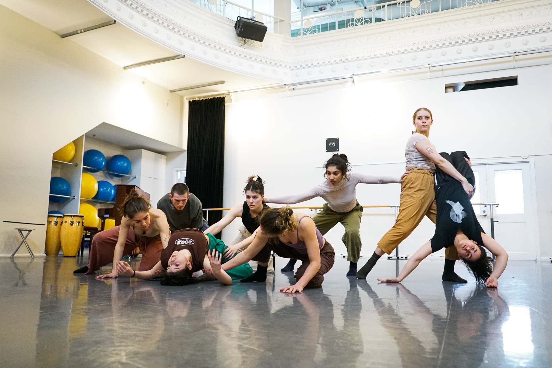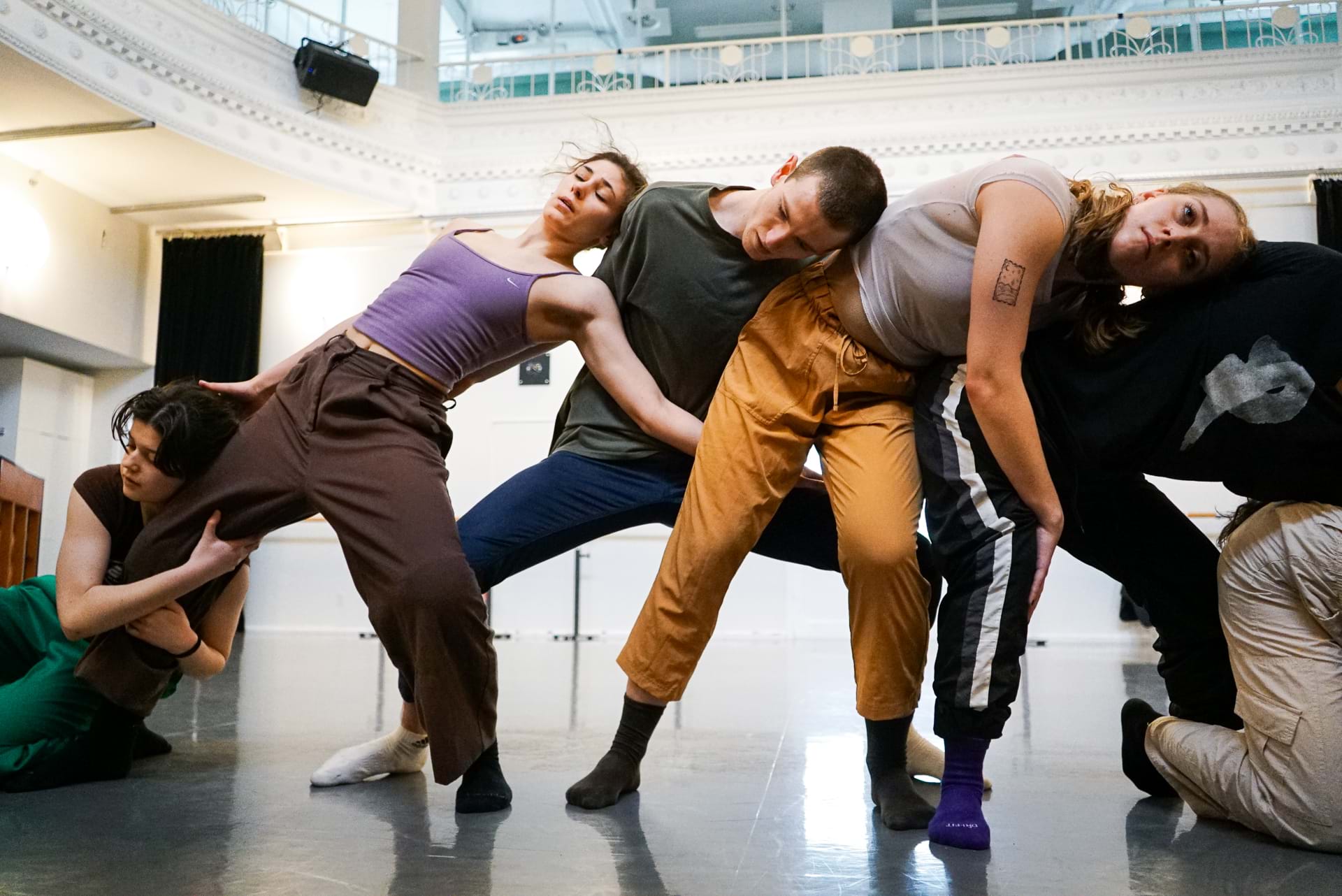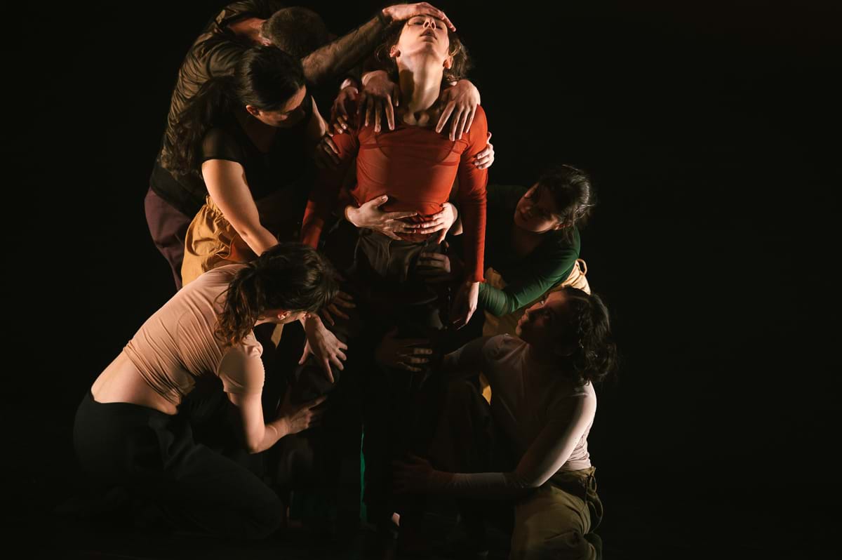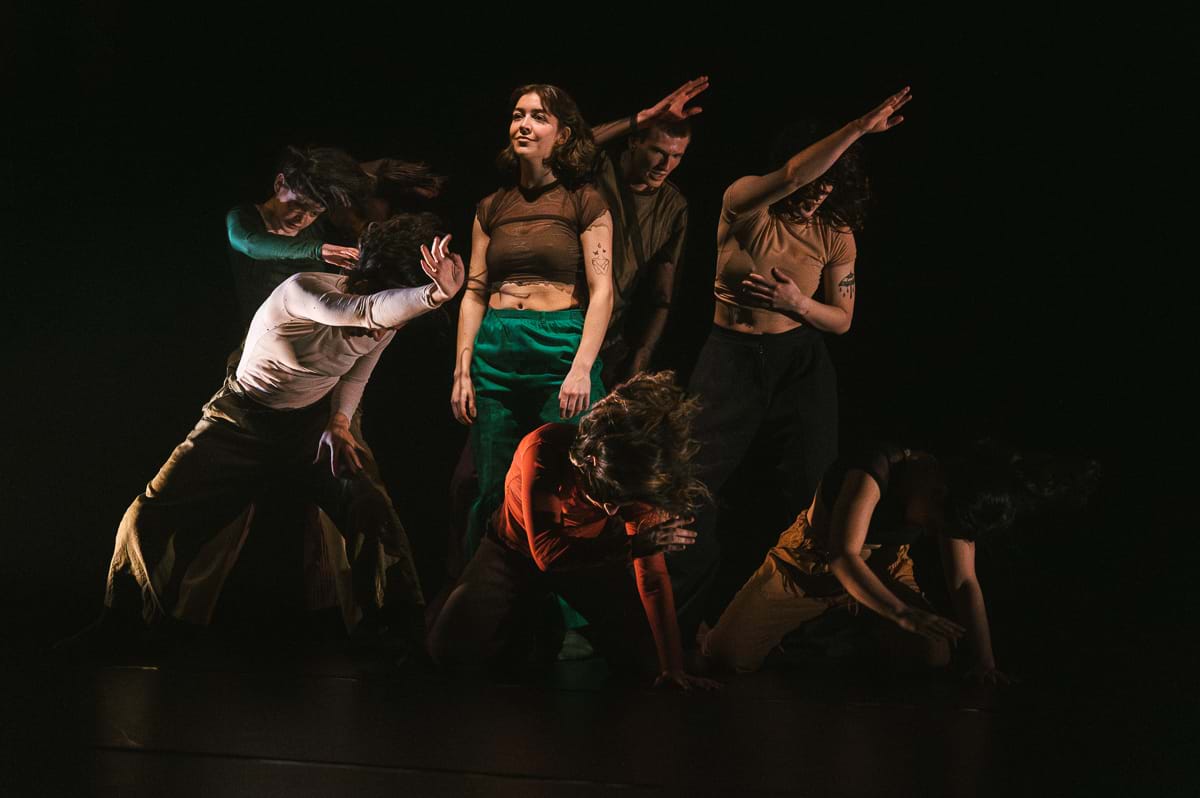 Sur le plan physique, je travaille beaucoup dans l'ouverture du cœur, dans la notion du dos, la fermeture. Physiquement, il y a une nécessité cardiovasculaire, une nécessité physique. Ma danse est très dansante, [mais] d’une bonne façon. Et elle est aussi beaucoup basée sur l’état. Quand ils arrivent [sur scène], les uns après l'autre, ils se tiennent simplement debout là, présents, et cela me donne toujours des frissons! Parce que je les vois. Ce sont des animaux, un personnage, un monstre…et là, ils font quelque chose de très humain, ils sont en contact les uns avec les autres, ils se touchent - c’est encore plus spécial post-pandémie. Et puis, ils arrivent, se présentent. « Je suis moi, je suis là. » À partir de ce moment-là, pour moi, il y a comme un shift qui s’opère. C’est un moment d’empowerment. Empowerment of your body, of your sensuality, of your connexion to others, of the community… Il y a une notion d’entraide dans la dernière section. « Jusqu’au bout, c’est ensemble qu’on va réussir. On sait ce qui s’en vient [...], le groupe supporte l’individu et l’individu supporte le groupe. » Il y a cet altruisme. [...] C’est comme ça que je vois [la pièce]. Il y a quelque chose de « Mon tour va venir. » On perd l’individualité au service du groupe.