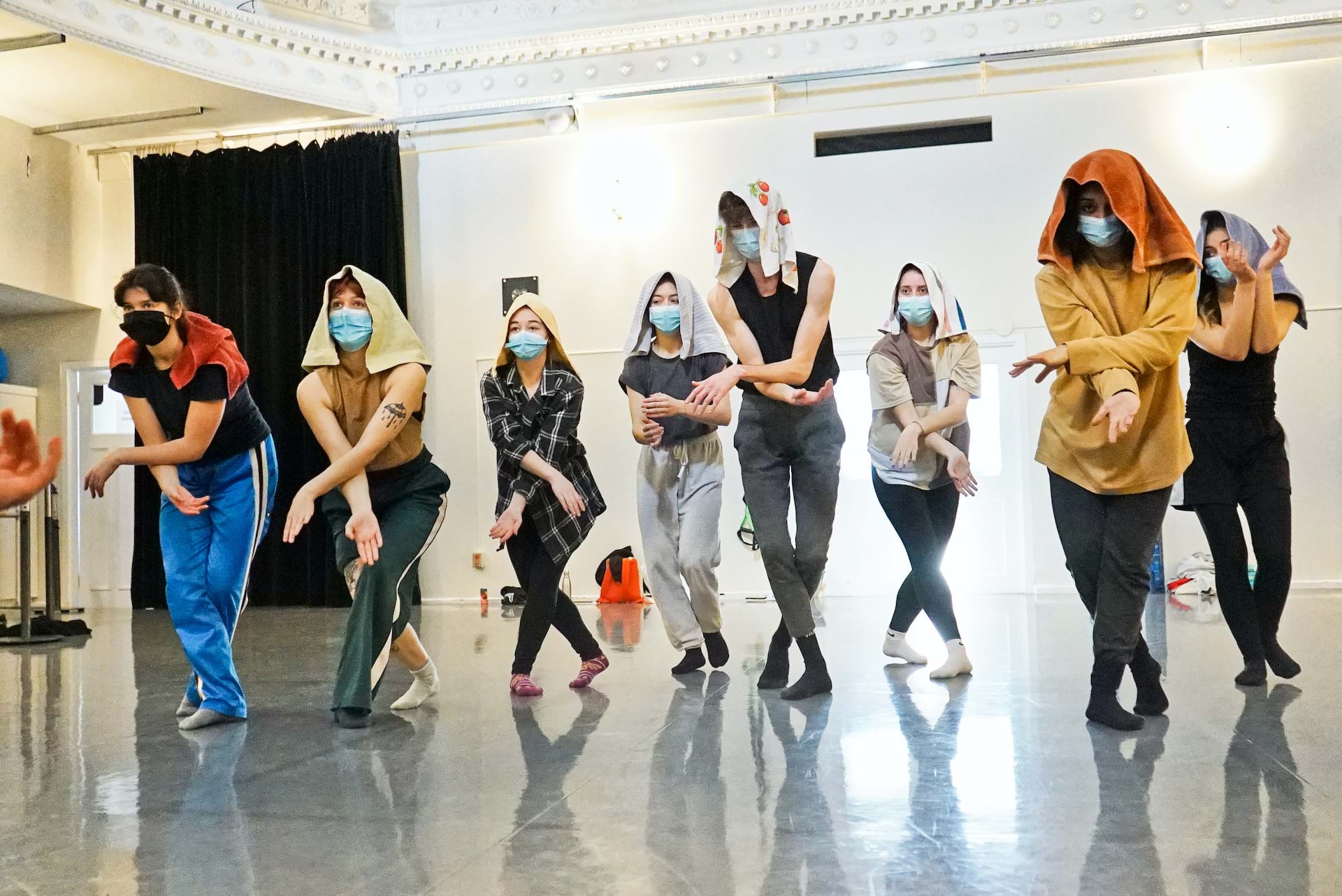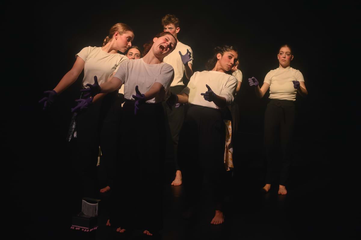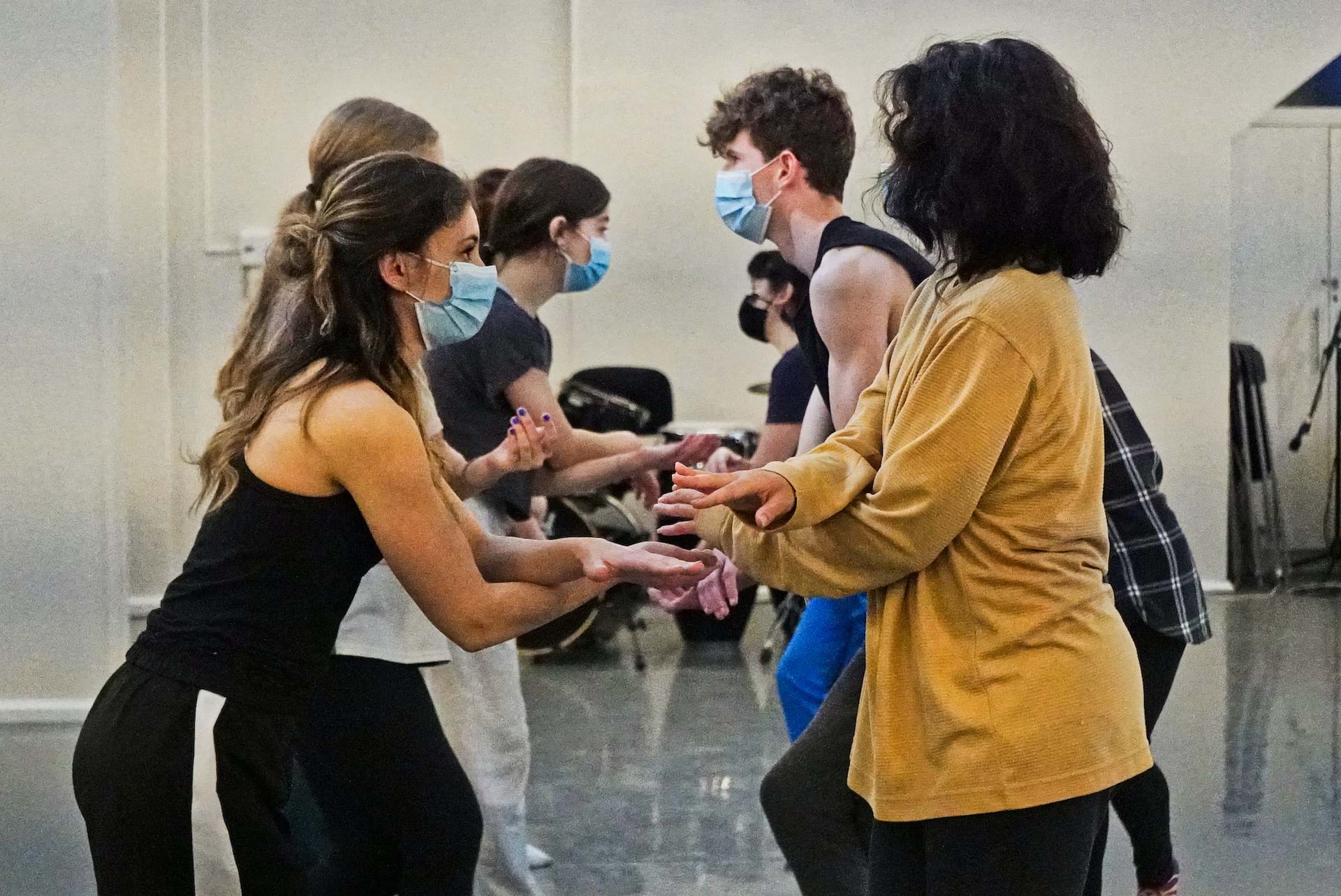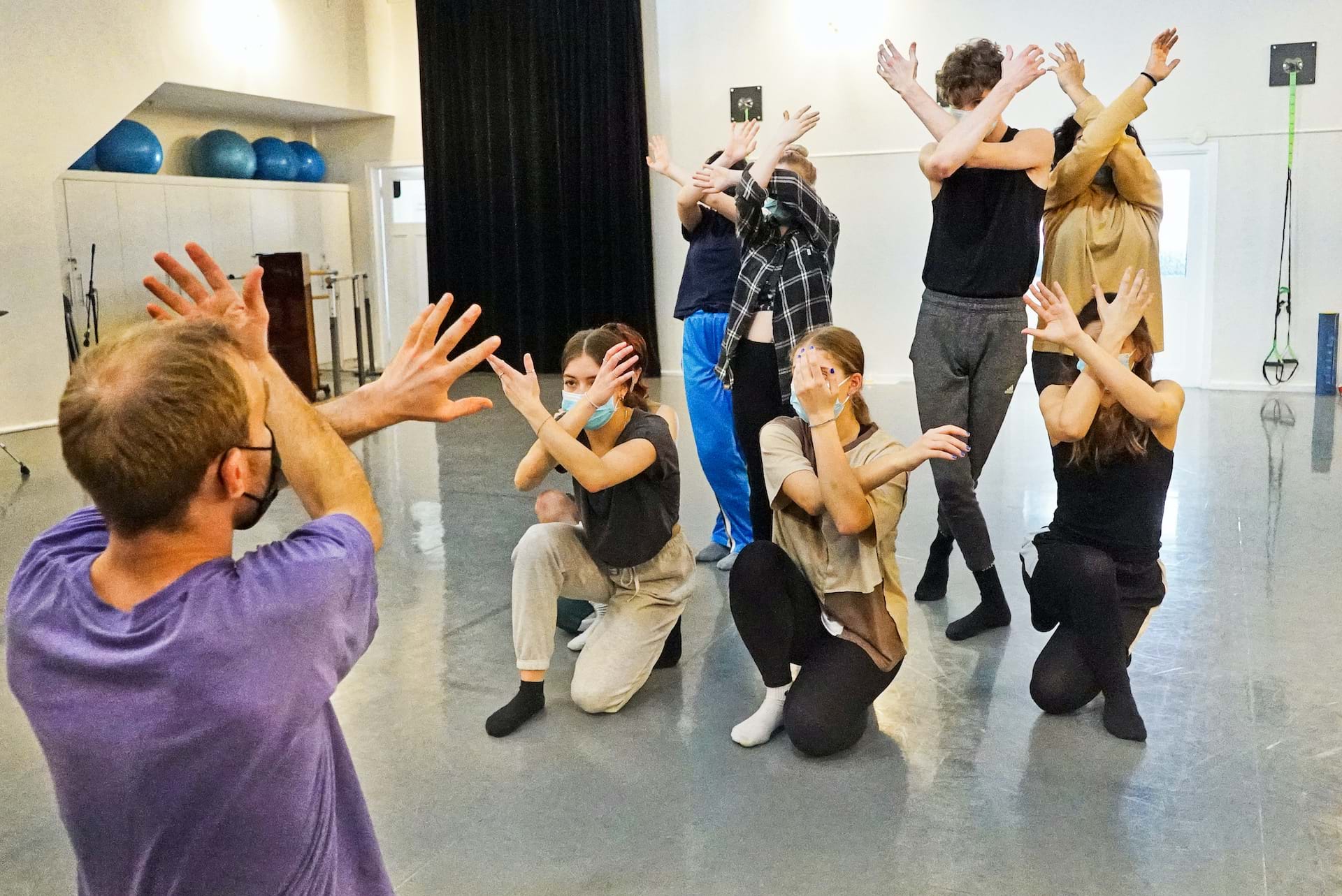Dès les premières périodes de création, j’étais à la recherche d’un cadre adéquat pour nous permettre de nous rencontrer, à mi-chemin entre nos imaginaires respectifs. Je cherchais à créer un environnement de confiance mutuelle où les étudiant.e.s accepteraient d’étendre leur zone de confort et d’exister avec une certaine authenticité. Puis, j’ai été porté par des envies qui m'habitent depuis quelque temps, soit une recherche d’expressivité spécifique des mains et des visages. Cela rejoint l’une de mes obsessions du moment : exister sur scène dans un dialogue perméable entre son propre imaginaire et l’imaginaire collectif qui se construit dans l’instant présent.